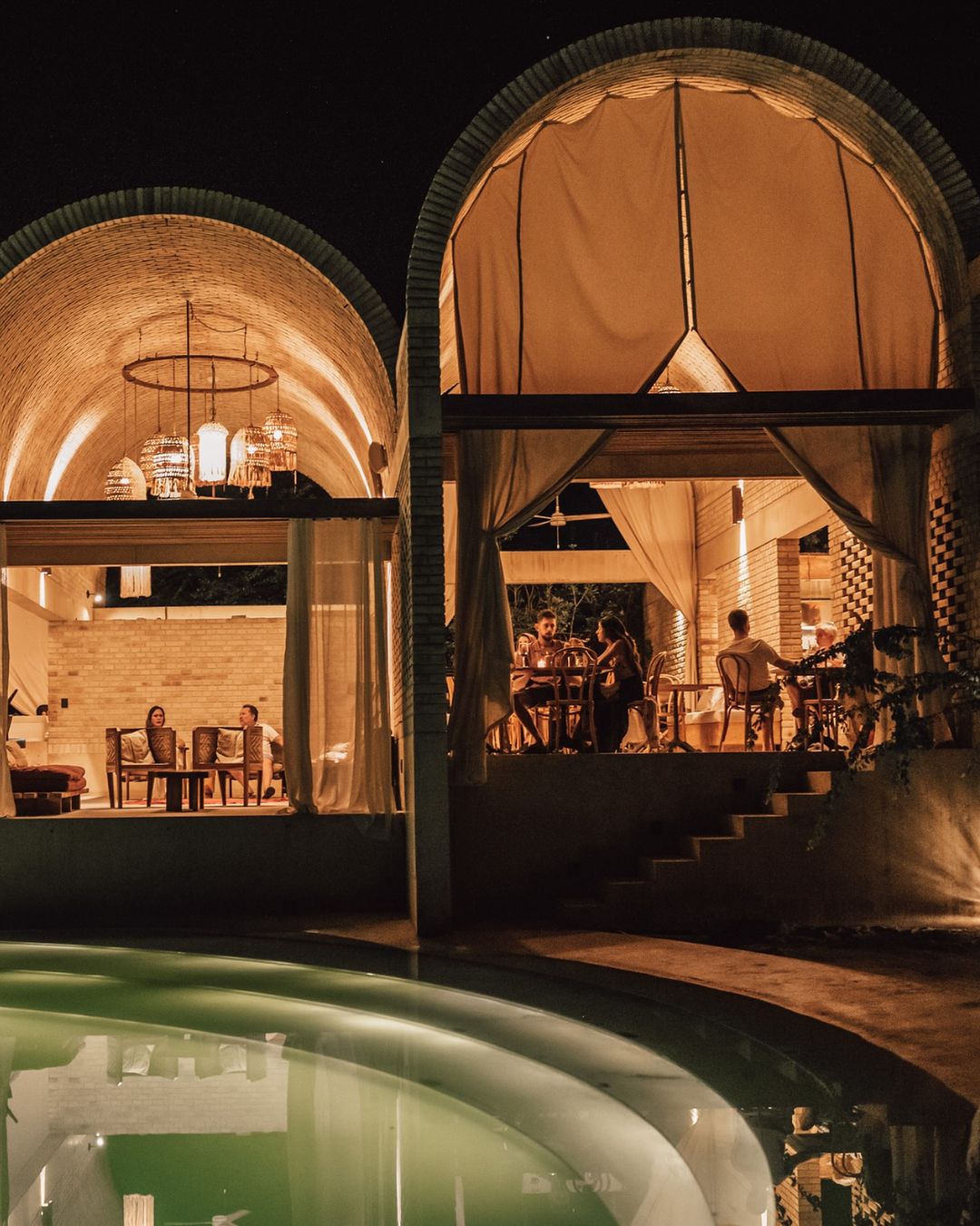 Guests can enjoy meals in the charming open-air courtyard, surrounded by lush greenery and soft lighting, making it a perfect setting for a romantic dinner or special occasion.