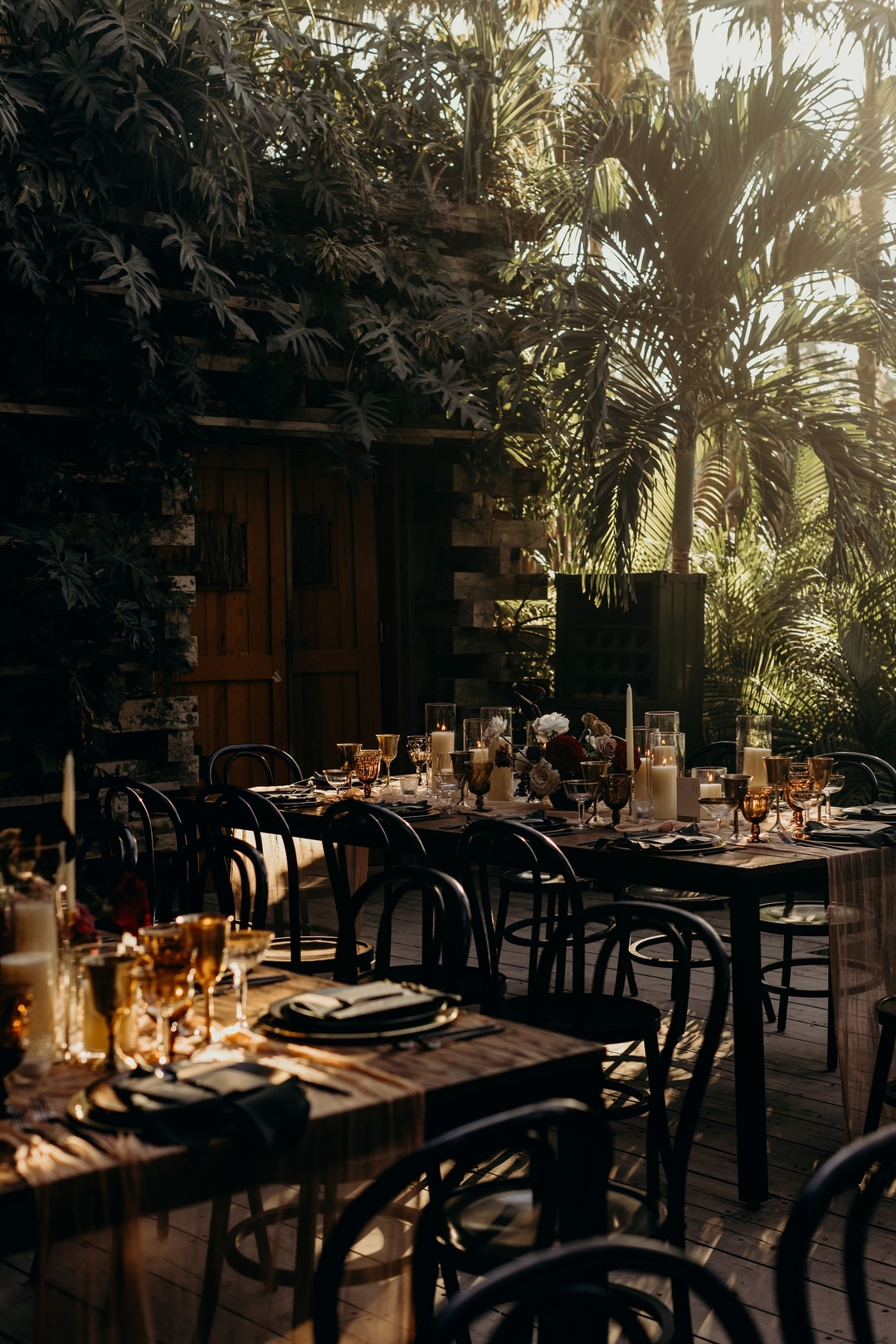 Dine in an enchanting open-air setting surrounded by the natural beauty of Tulum's jungle, with soft lighting and lush greenery creating a magical and intimate atmosphere.