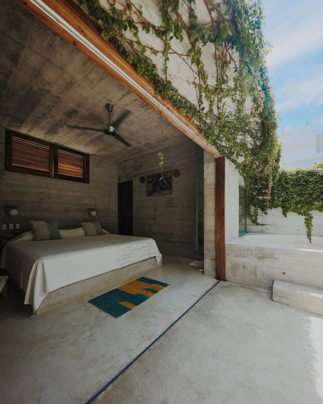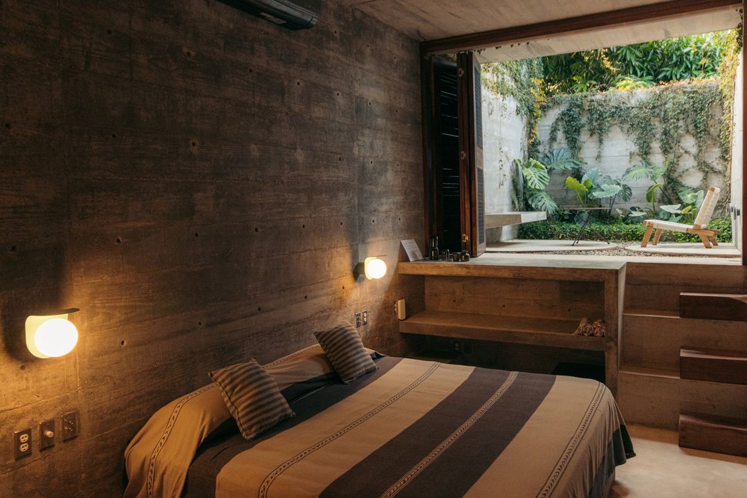 Casa TO is known for its striking brutalist design, featuring raw concrete structures that create a minimalist, modern aesthetic that stands out in Puerto Escondido.