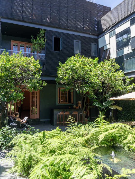 Relax in the serene, verdant courtyard filled with native plants and trees, providing a peaceful escape in the heart of the bustling Roma neighborhood.