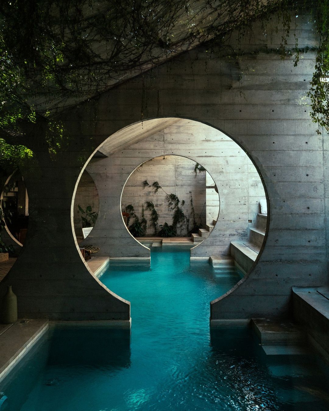 The hotel’s focal point is a long, serene central pool surrounded by the concrete walls, offering a tranquil oasis for guests to relax and cool off in a unique architectural setting.